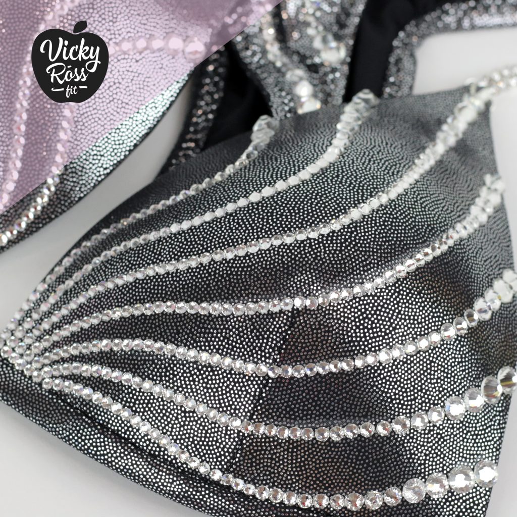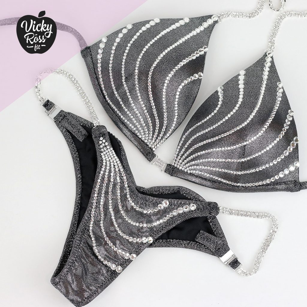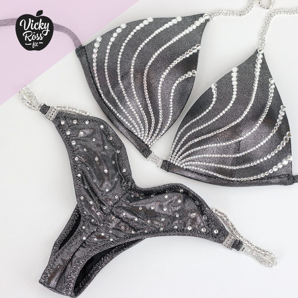Affordable Competition Bikini Handmade by Vicky Ross Fit that refreshes your Look! Such a gentle and bright, it will definitely become your special feature. The color of this bikini perfectly shades the tan and attracts even more attention to your body. This Gray Holographic Spandex Fabric glows bright on the stage. This Fitness Bikini Suit will perfectly show your hard work on yourself!