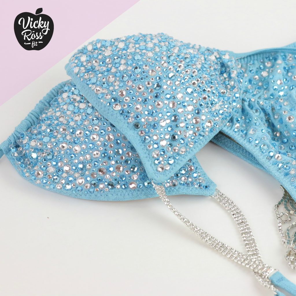 Pure Sky color gently illuminate your Competitive look. The combination of Clear and Aqua Blue crystals creates a luminous appearance, which perfectly emphasizes your tenderness and femininity. Baby Blue Fitness Bikini will emphasize your dignity and show your attractiveness. With our signature adjustable drawstring triangle bikini cup you can easily adjust the competition to your needs; make it more revealing or humble. So in this Vicky Ross Fit Bikini you will look Stunning!