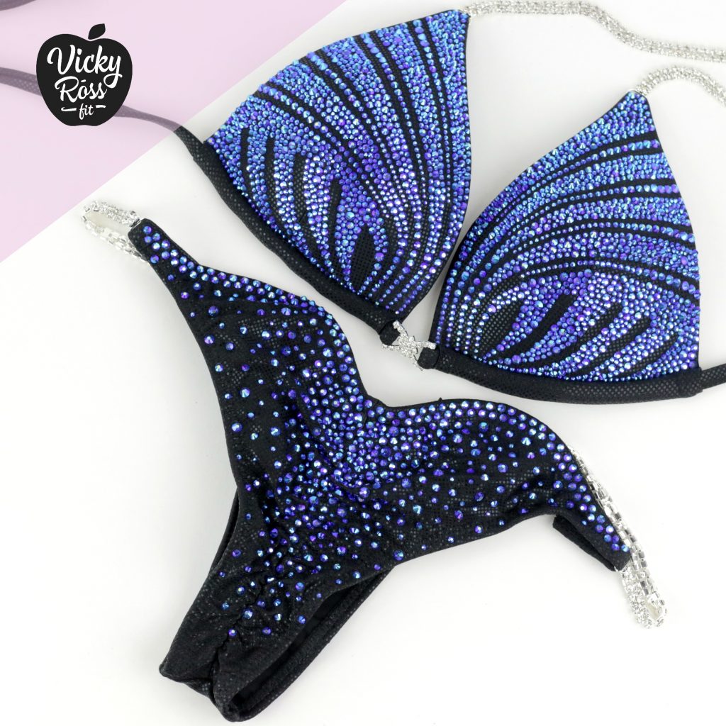 Black Sapphire Ocean Wave bikini will add to any Competition Look more of brightness and immediacy. A beautiful combination of Black Holographic Material and Hand applied Crystals will add tenderness and brightness to your Ideal Body. The mermaid will exactly envy your bright Competition bikini suit!
