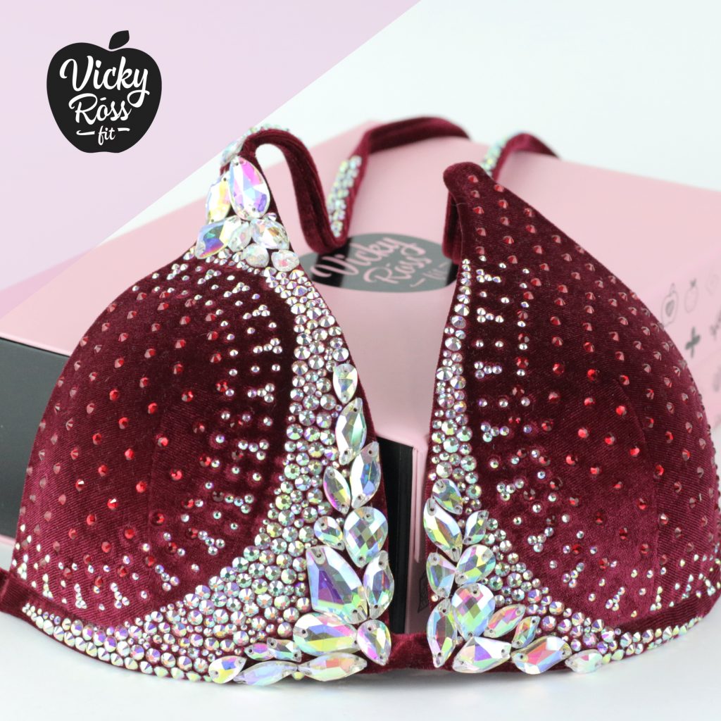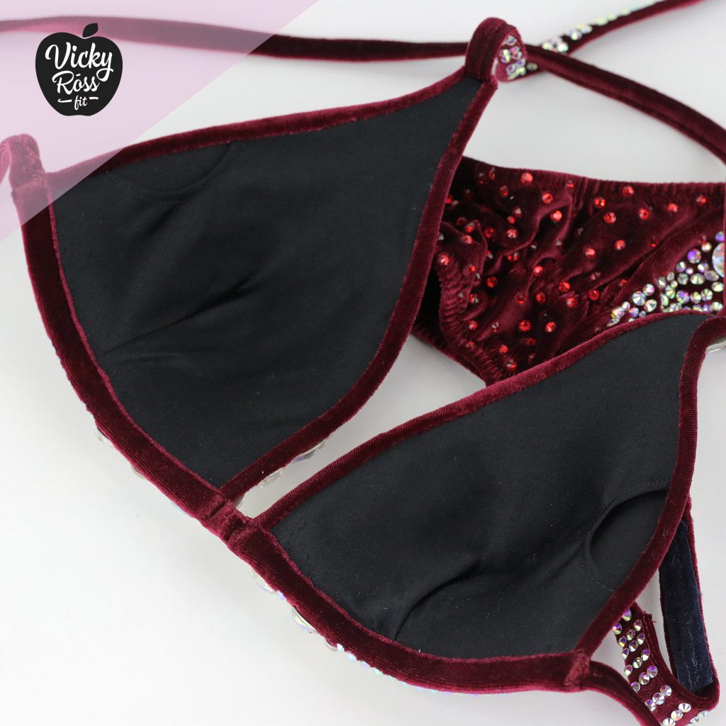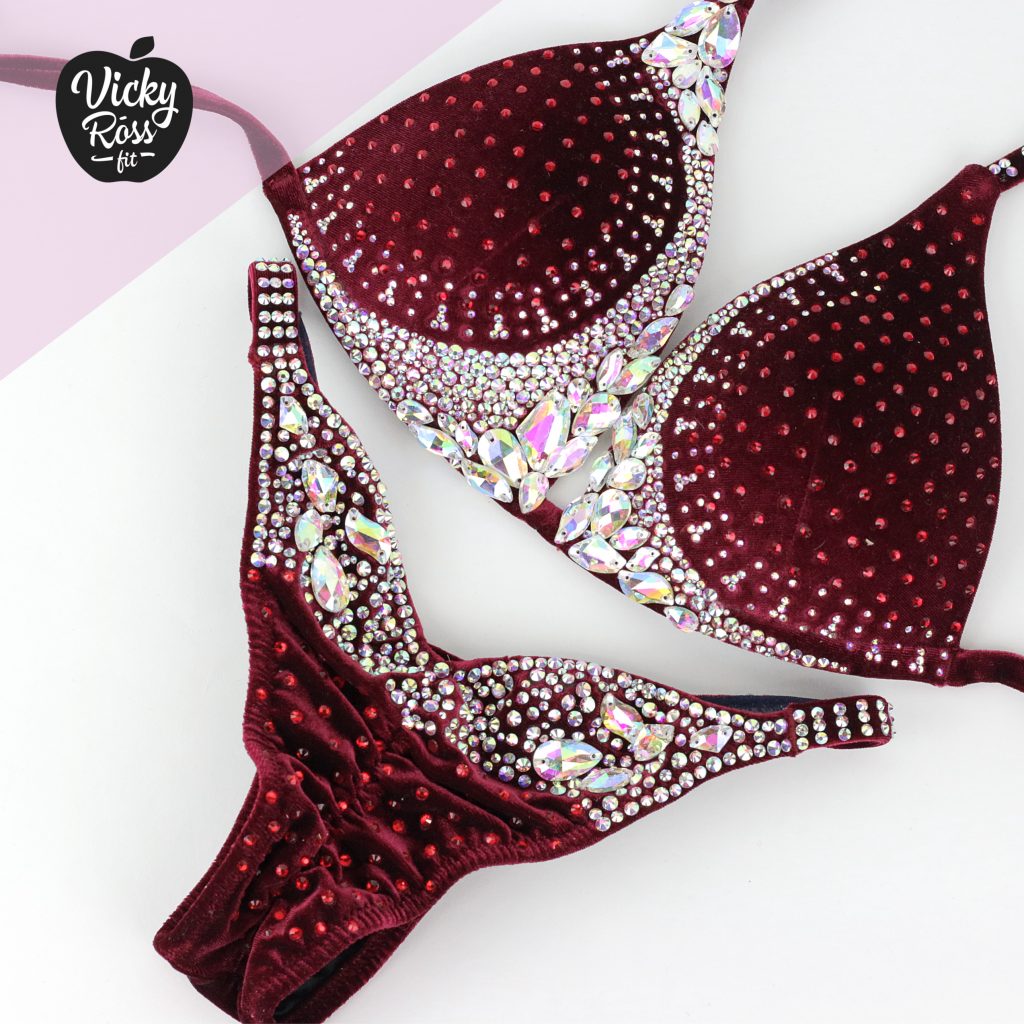 We have designed and handmade this Burgundy Designer Bikini with the contest in mind, and we certainly have brought out our best by creating Vicky Ross Fit Signature Collection! This molded bikini boasts Siam and AB crystals in an elegant, stylish makeup that’s sure to amaze. Compliment your competition bikini suit even more with beautifully matching competition jewelry set of “AB Crystal Earrings & AB Crystal Bracelet”. The soft, deeply pigmented velvet fabric is sophisticated, without sacrificing style.