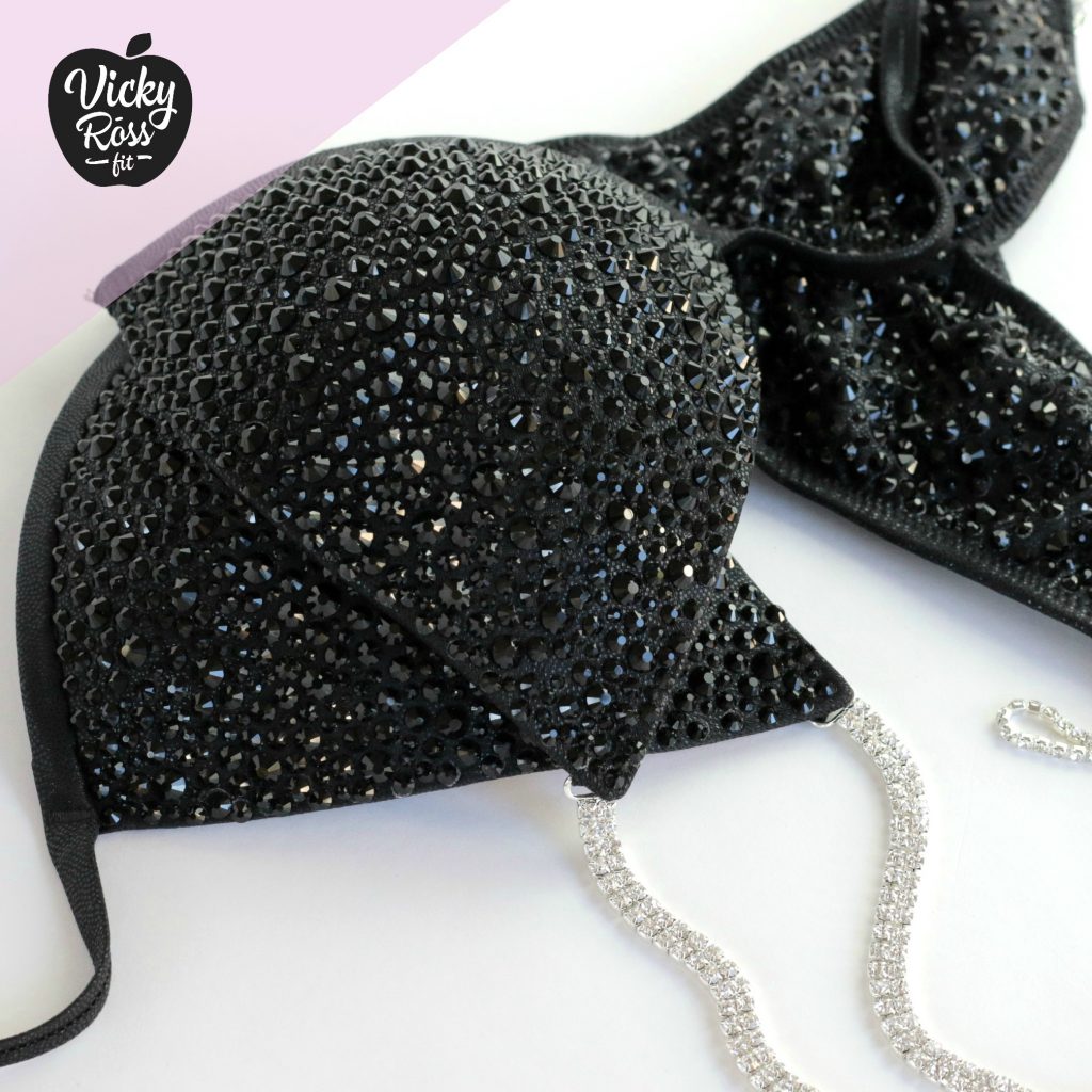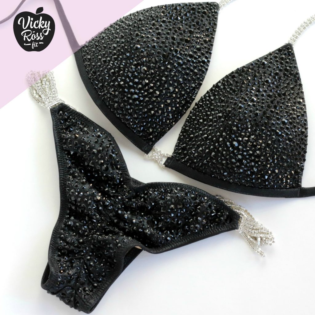 Do you think that a Black Fitness Competition Bikini is too simple and boring? I assure you that you are wrong! This Crystal Black Dragon Handmade Bikini is great for winnings at competitions! This bikini will perfectly emphasize your beautiful figure and highlight your dignity. Black Holographic Material and Hand applied Black Jet Crystals allow you to shine brighter than the sun on the stage!
