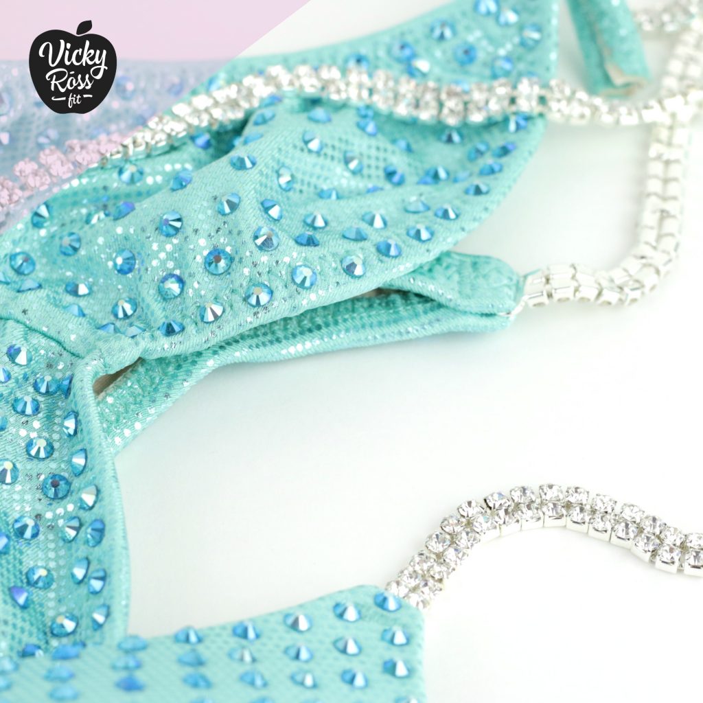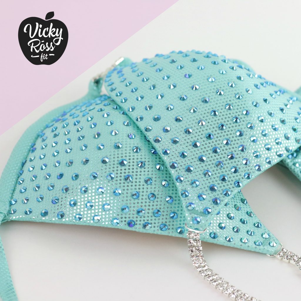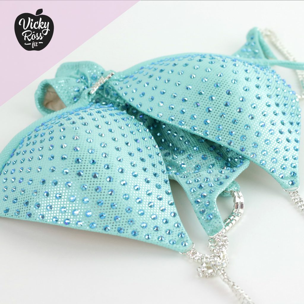 This cute bright Mint Bikini Fitness Suit perfectly attracts attention! Lovely Mint crystal Bikini with bright splashes of Aqua AB Crystals. This Holographic Fitness Competition Bikini looks awesome on stage and reflects the light well. This Bikini Suit will perfectly show your hard work on yourself!