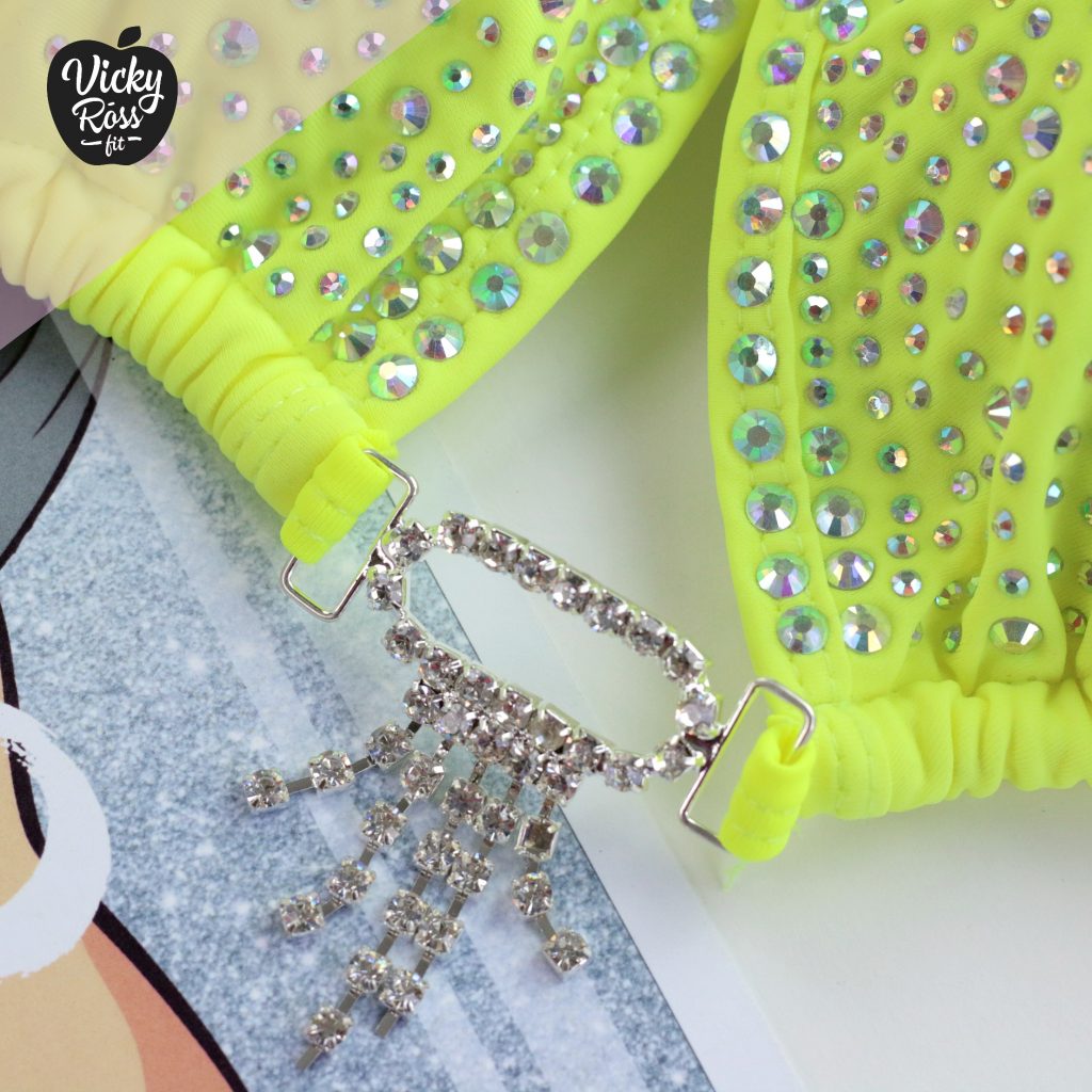 Bright, catchy and provocative Neon Yellow Bikini Competition Suit ! This Cute Bikini easily emphasizes your figure. It is an excellent shade of tan and attracts attention. Decorated with AB crystals and sparkling straps, so this bikini will keep all eyes on you!
