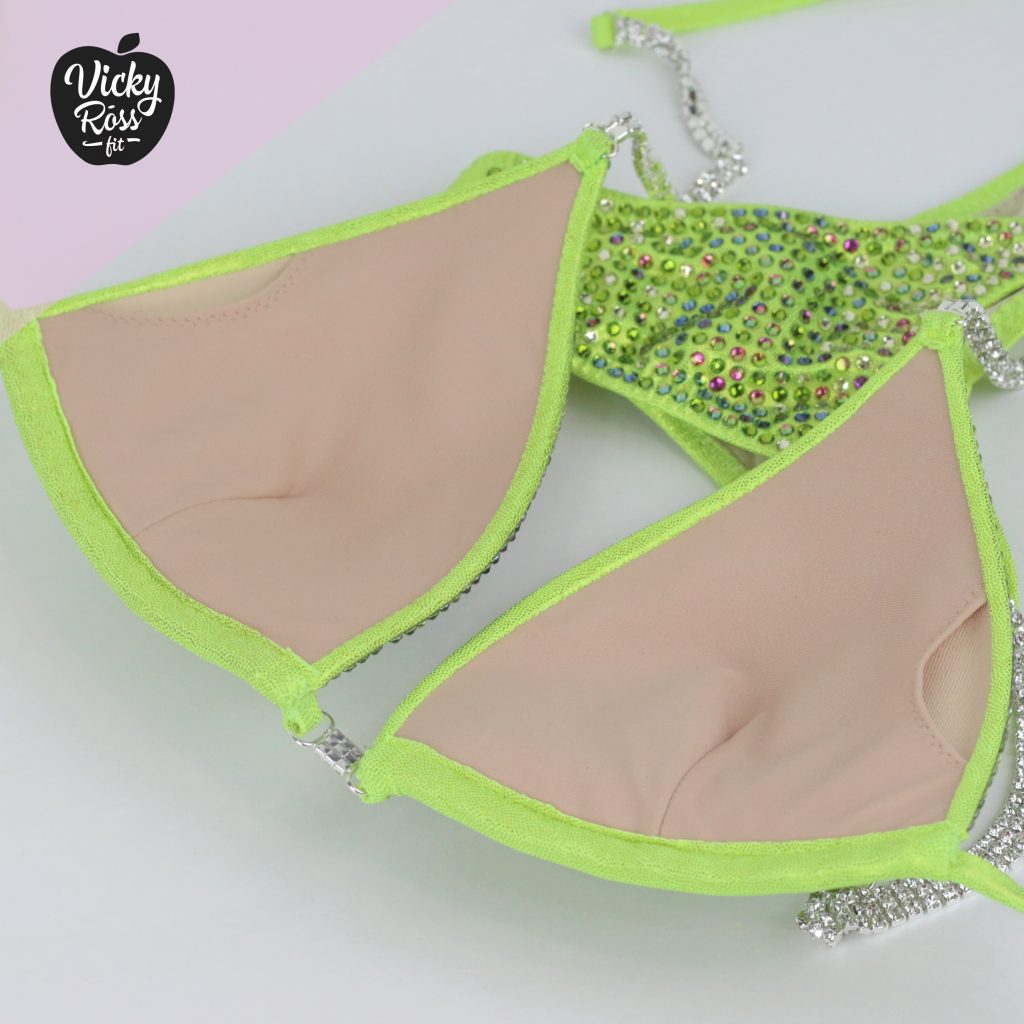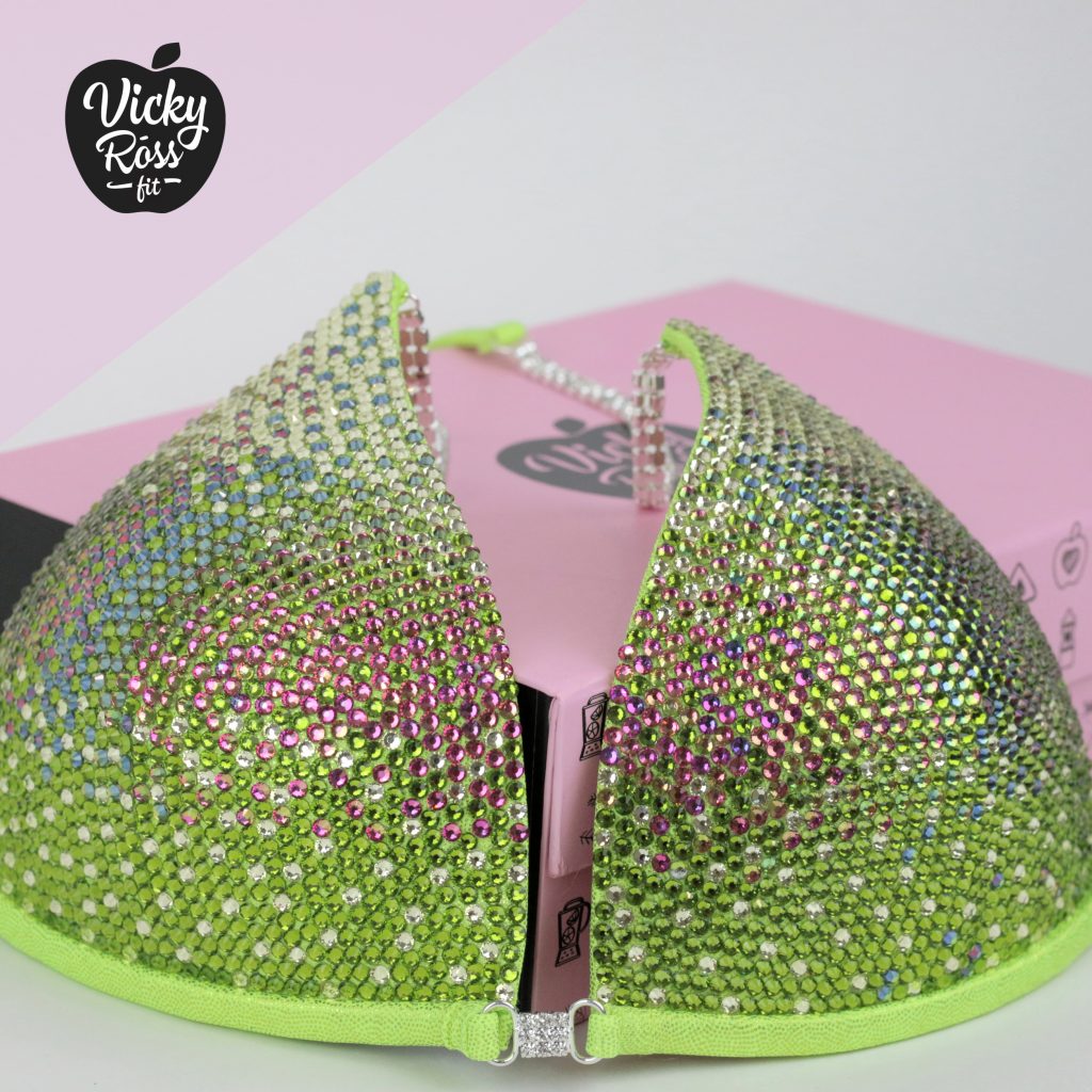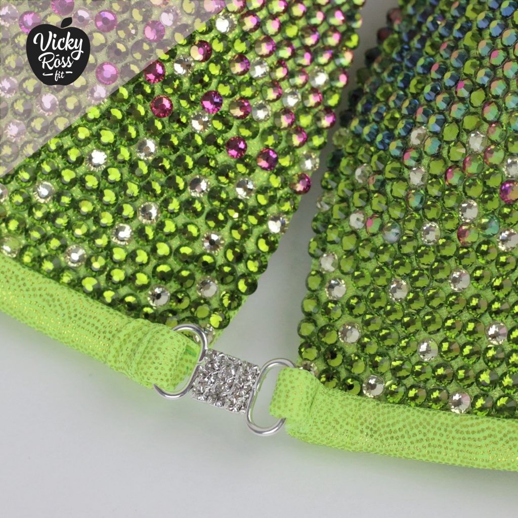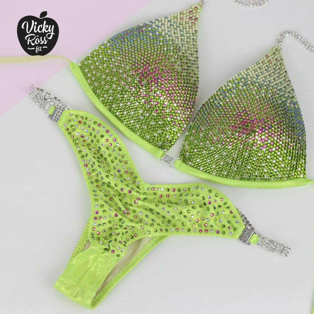Bright neon colors associated with successful performances are a trend that is needed this Competition Season. Perfect bright neon Holographic Fabric combined with expressive crystals is an Extraordinary charge of colors that will decorate your Body. Its color will perfectly reflect your tan and give freshness. This Neon Yellow Ombre Competition Bikini Suit by Vicky Ross Fit will help you look incredibly bright among the other contestants. The beauty of your Competition Look will amaze Everyone!