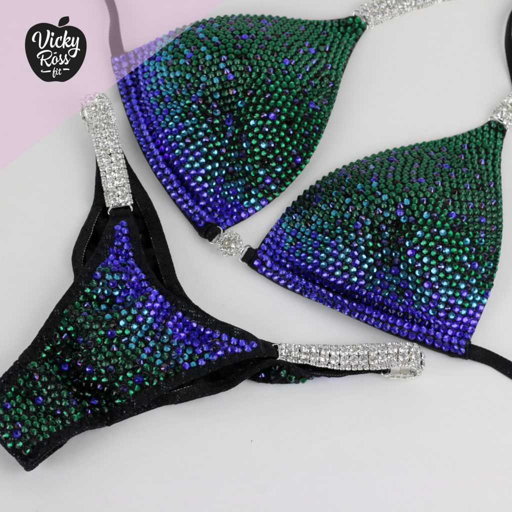 So bright and sparkling. Ideal for Bikini Competitions! Fabulous crystals of Hand applied Crystals and Black Holographic Fabric perfectly reflect light and allow you to glitter on stage. This NPC Bikini Fitness Bodybuilding Suit Handmaded by Vicky Ross Fit is created in love to highlight all your dignity. The Beauty and Muscularity of your body will charm the judges. With this Bikini all Attention belongs Only to You!