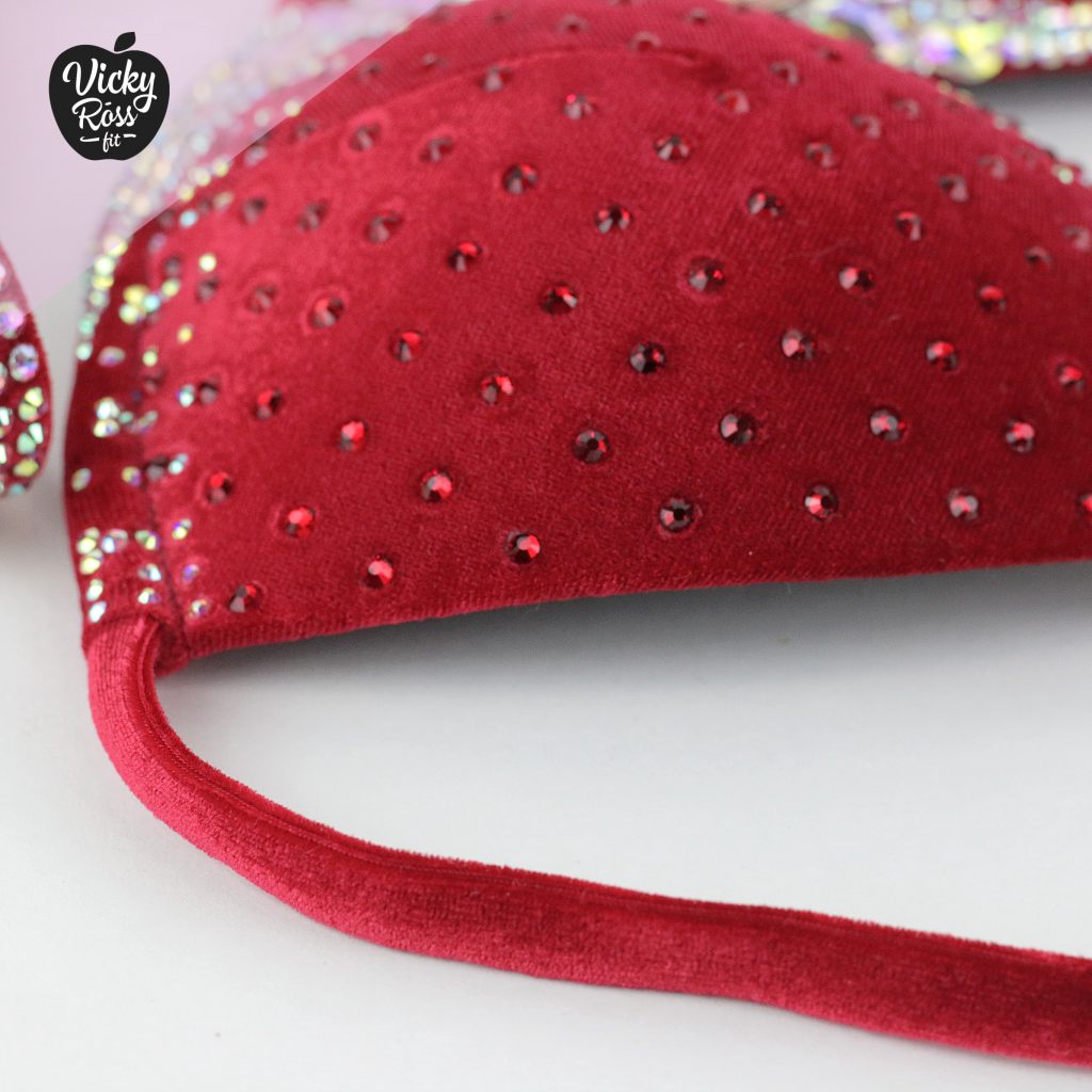 We have designed and handmade this Red Designer Bikini with the contest in mind, and we certainly have brought out our best by creating Vicky Ross Fit Signature Collection! This molded bikini boasts Siam and AB crystals in an elegant, stylish makeup that’s sure to amaze. Compliment your competition bikini suit even more with beautifully matching competition jewelry set of “AB Crystal Earrings & AB Crystal Bracelet”. The soft, deeply pigmented velvet fabric is sophisticated, without sacrificing style.