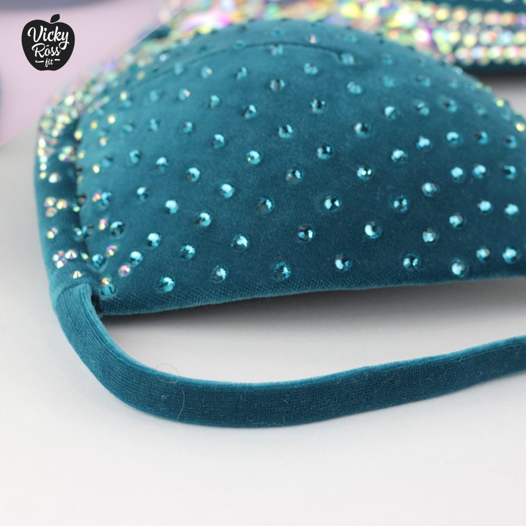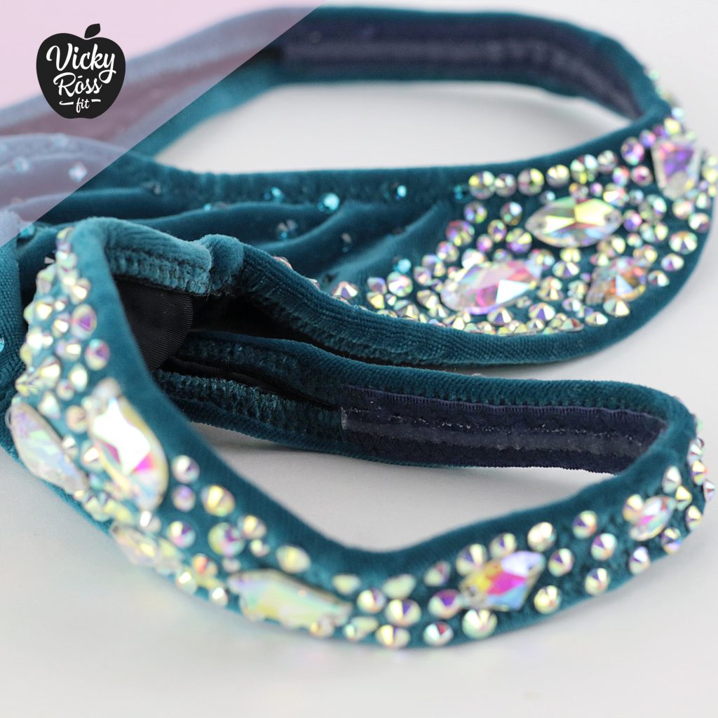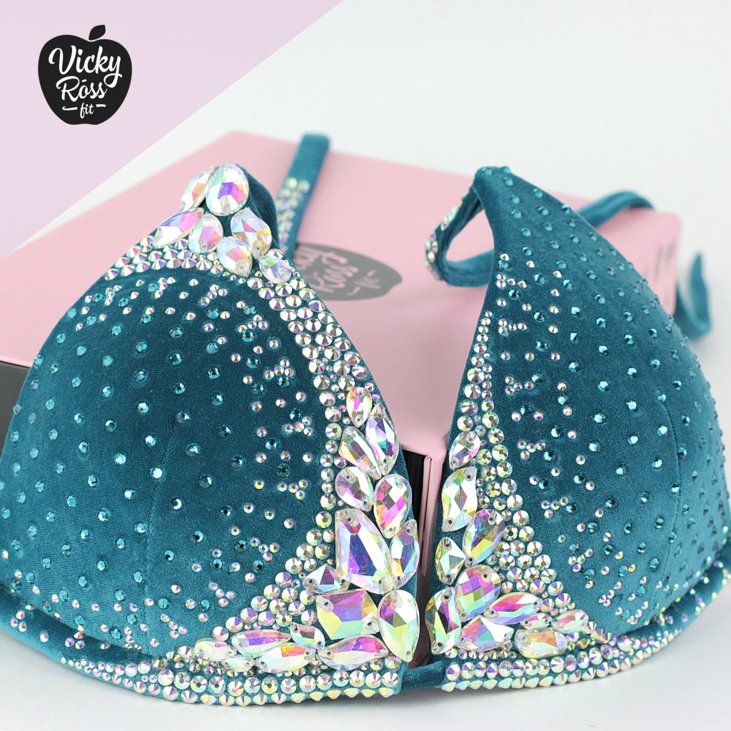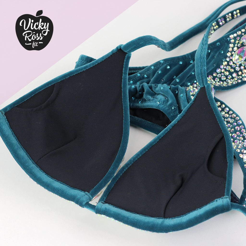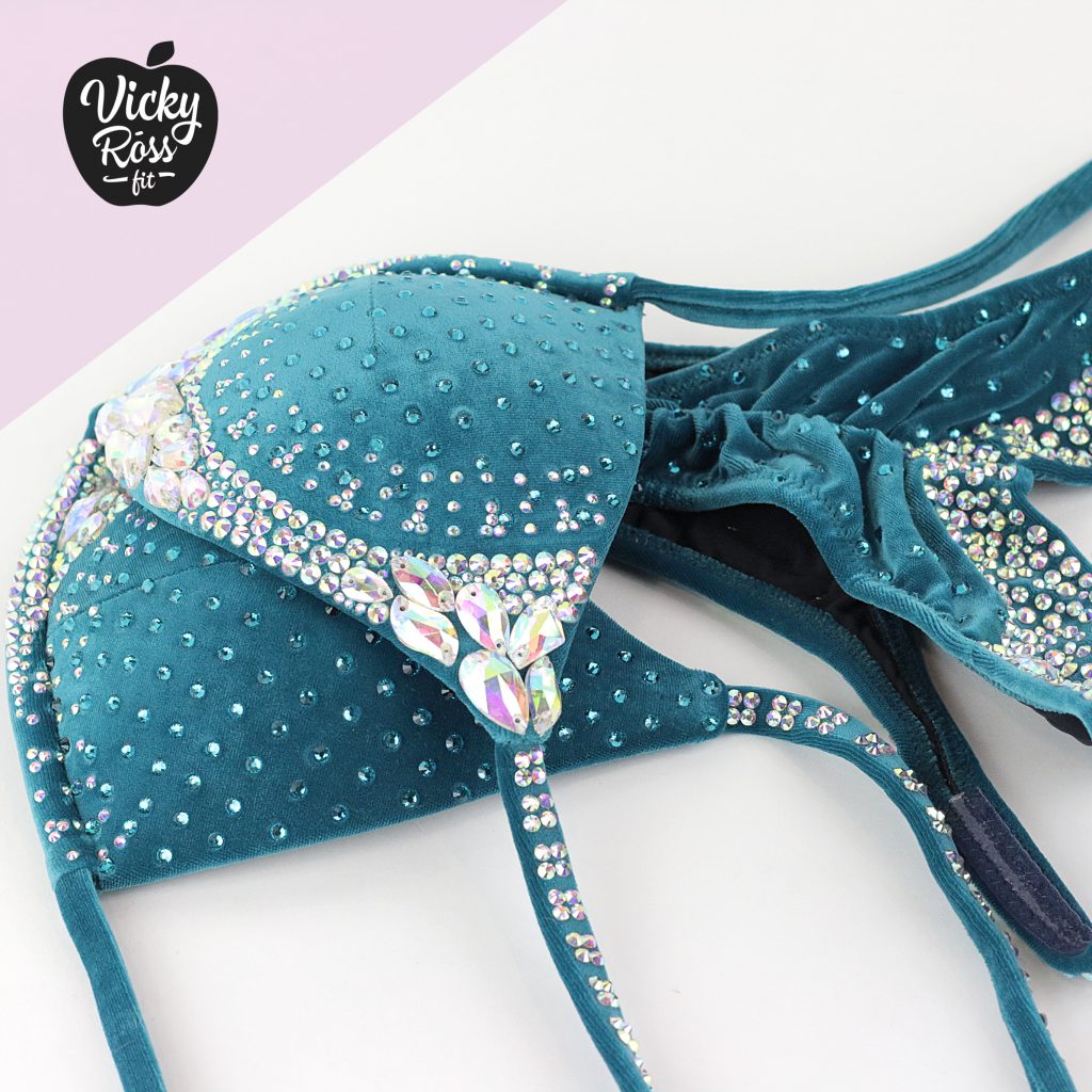 We have designed and handmade this Turquoise Designer Bikini with the contest in mind, and we certainly have brought out our best by creating Vicky Ross Fit Signature Collection! This molded bikini boasts Aqua and AB crystals in an elegant, stylish makeup that’s sure to amaze. Compliment your competition bikini suit even more with beautifully matching competition jewelry set of “AB Crystal Earrings & AB Crystal Bracelet”. The soft, deeply pigmented velvet fabric is sophisticated, without sacrificing style.