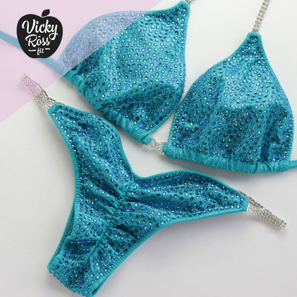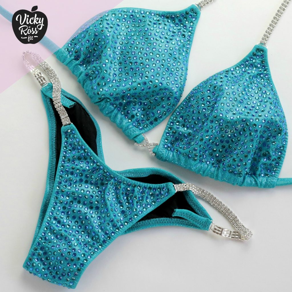 Showcase your hard work and perfect tan with the Perfect Bikini. This handmade Turquoise Handmade Bikini hugs you in all of the right places and makes your skin tone pop. Especially created for first time bikini competitors, the Capri Blue and Blue Zircone crystals will glow in the limelight! Set yourself apart from the crowd with this dazzling teal two piece bikini.